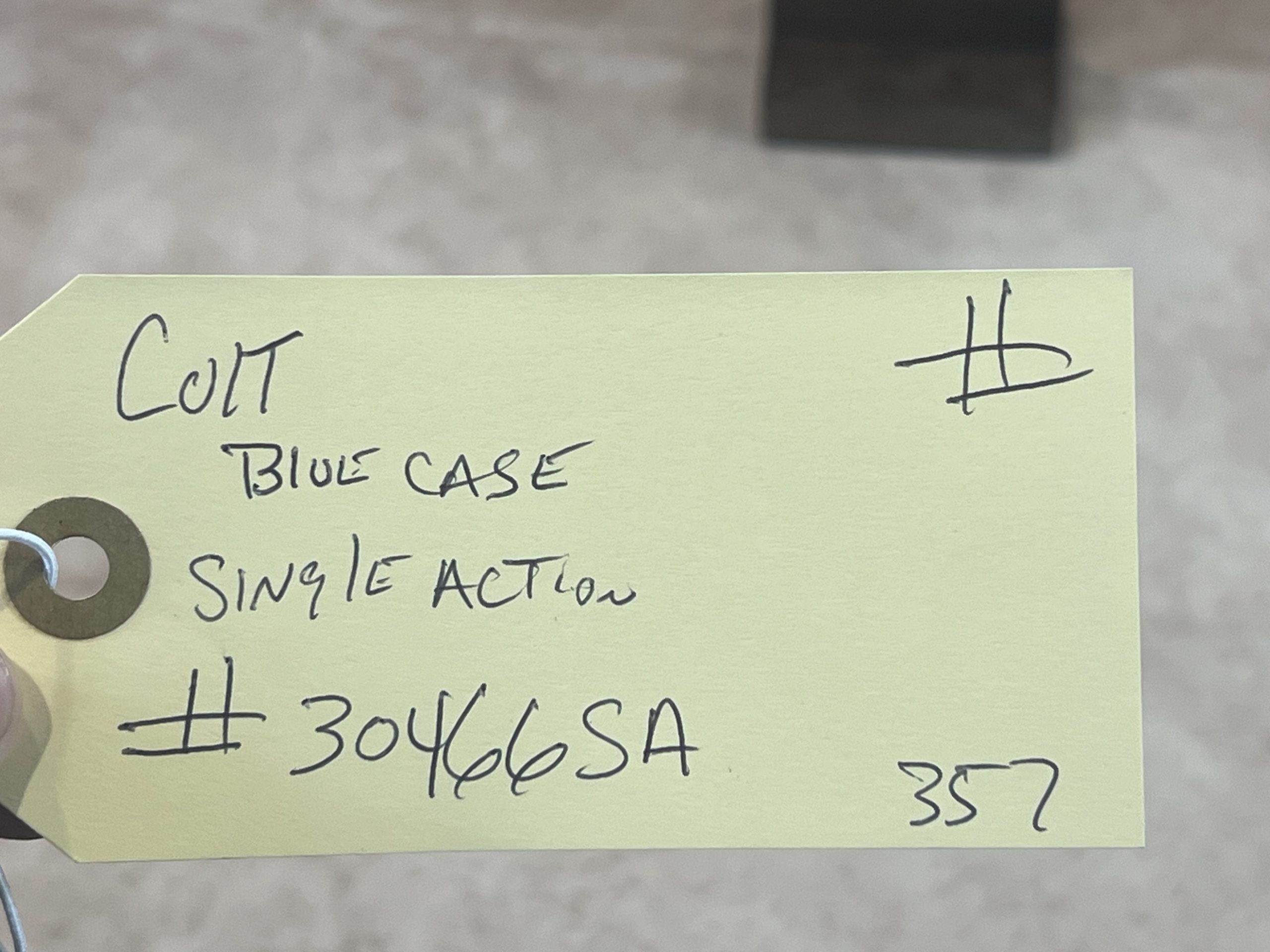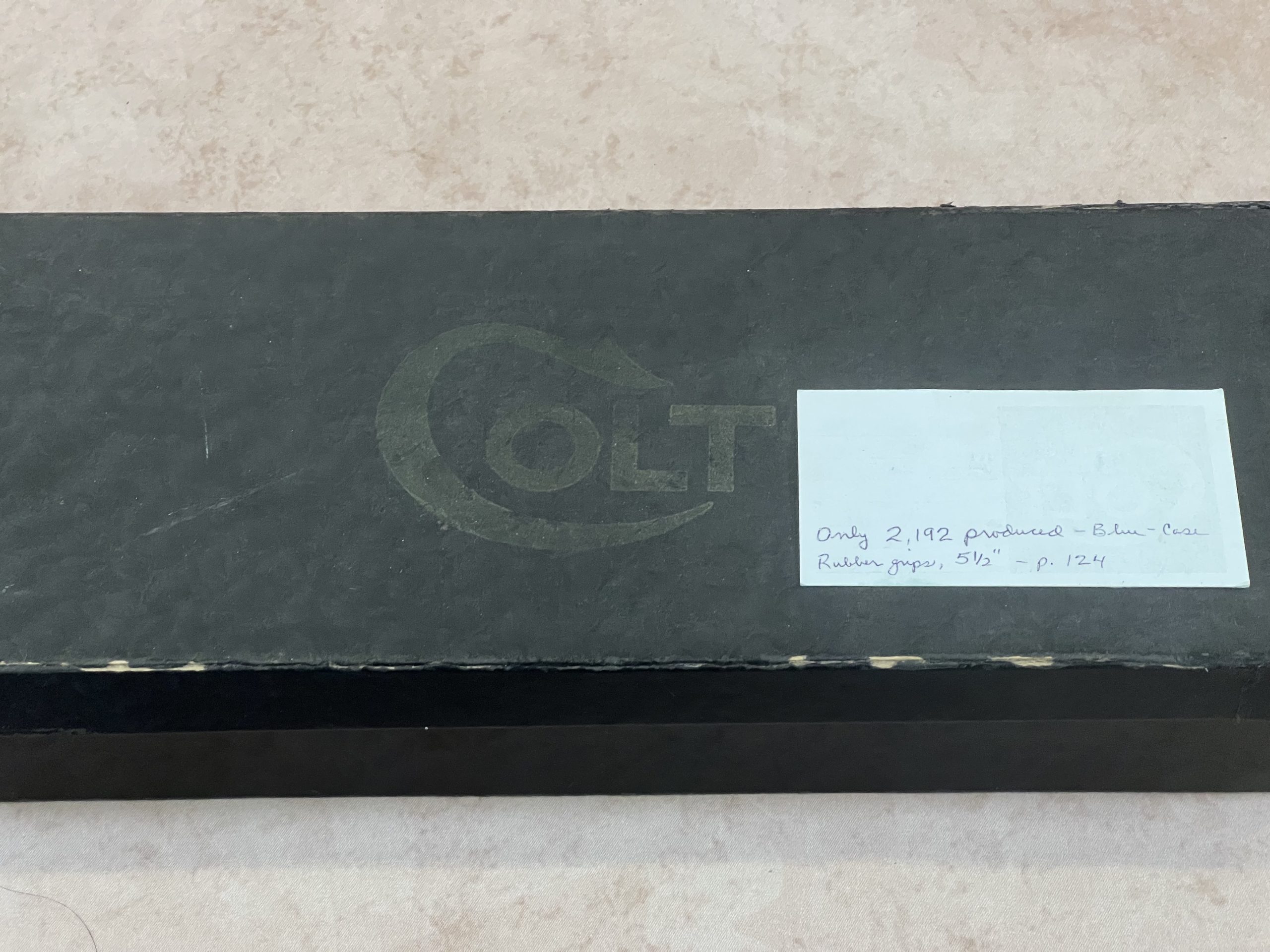 This single action was produced in 1970. The pistol’s serial number is 30466SA. This Colt is fitted with a 5 1/2 inch barrel chambered to shoot the 357 cartridge. This Colt is in unfired condition. The original bluing would rate a 100% condition. This would also go for the stunning color cased finish. This color cased finish has very strong colors with bright highlights. There is no sign of being cocked or played with. This is a stunning looking Colt that would be a standout in any collection! These second generation Colt’s in this fine of condition are getting hard to find today. Here is one of the best to come up for sale! This box of shells is for display only and not for sale.