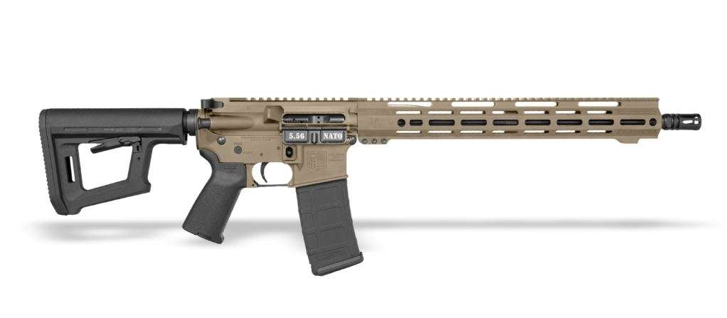 Finish: FDE CerakoteCaliber: 5.56NATOBarrel: DB Barrels,16in, 1:8RH, Medium, 4150 CrMov, BlackNitrideGasSystem: Mid-lengthBCG: Shot-Peened, Magnetic Particle Inspected MilSpec 8620 CarrierUpper: A3 Flattop Forged 7075T-6 Aluminum, T-MarkedLower: 7075T-6 Aluminum (DB15 Carbon Lower)Handguard: 15 in M-LOK rail with texture pads,full picatinny, front & rear QD, and hand stopGrip: Magpul MOE gripStock: Magpul MOE PR carbine stockMagazine: Magpul gen m2 pmag 30rdSights: nonemuzzledevice: A2 5.56 cal flash hider(1/2×28)trigger: standard mil-specweight: 6.7lbsLength(collapsed/extended): 32.75in/36in