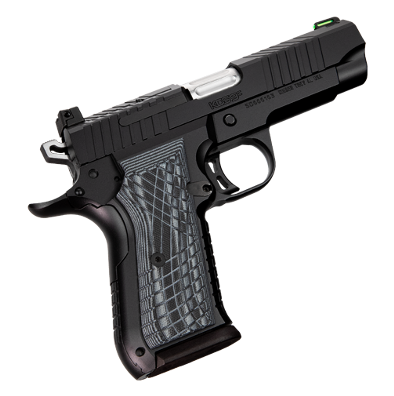 Kimber KDS9c 9mm 4″ KimPro Black 15rd Optic Ready Slide; Front Green Fiber Optic Front Sight; Stainless Slide w/ Front & Rear Cocking Serrations;Reversible Mag Release; Gray & Black Crosshatch G-10 Grips; 15rd Magazine