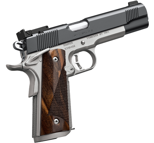 Super Match II .45ACP, 5″, Reverse Two-Tone Pistol Kimber Adjustable Sights, 8rd Magazine, Fancy Walnut Grips, SS Frame/Black Slide