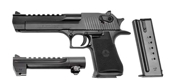 The Mark XIX Desert Eagle pistol offers true interchangeability. It features a full Weaver rail on the barrel from the end of the chamber to right behind the front sight and standard ambidextrous safeties. This model comes with a 6″ .44 Magnum black barrel and .44 Magnum magazine.
